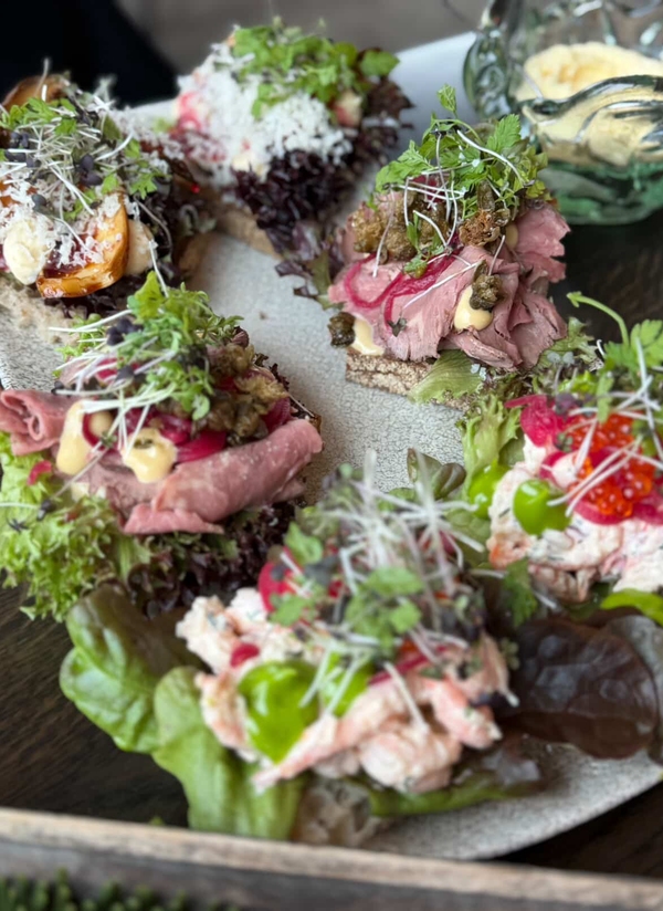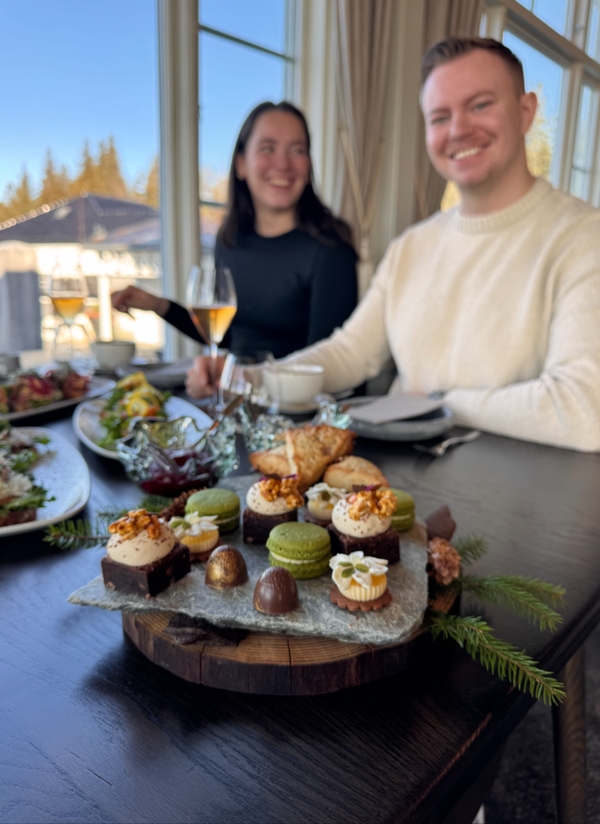 Vi serverer våre rause smørbrød, nybakte scones med klassisk tilbehør og et utvalg søte fristelser fra våre egne konditorer. Alt akkompagnert av god te og mulighet for et glass bobler for den som ønsker det.